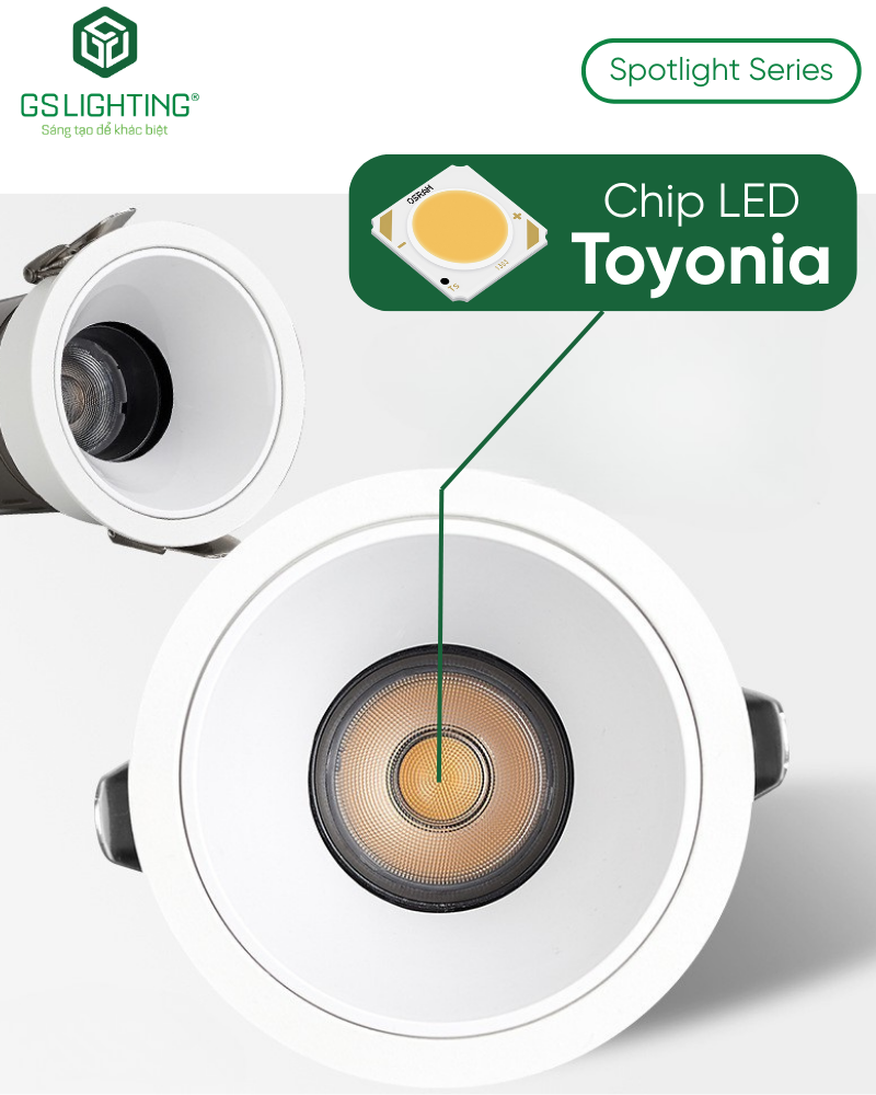 Theo dữ liệu bạn cung cấp, sản phẩm dùng chip LED Toyonia. Với spotlight âm trần, chip LED ảnh hưởng trực tiếp đến chất lượng màu, sự ổn định quang thông và độ đồng đều giữa các bộ đèn. Đối với các công trình B2B như showroom, phòng mẫu hay khu trưng bày vật liệu, đây là tiêu chí cần quan tâm vì chùm sáng spotlight rất dễ làm lộ sai lệch màu nếu chip không ổn định.