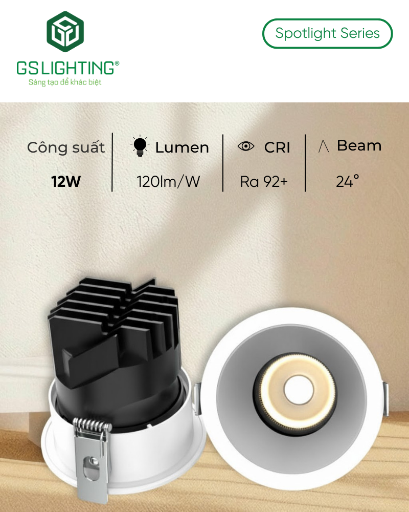Đèn Led Âm Trần Spotlight Chỉnh Góc 12W GSATSL12 là lựa chọn phù hợp cho công trình cần đèn led âm trần chiếu nhấn có chất lượng ánh sáng cao, dễ chỉnh góc và có tính ứng dụng rộng. Điểm đáng giá của model này nằm ở beam 24°, CRI 92+, hiệu suất 120 lm/W và khả năng hỗ trợ bài toán chiếu nhấn thực tế trong nhà ở, khách sạn, showroom và không gian nội thất cao cấp. Nếu bạn cần một mẫu spotlight âm trần dễ tư vấn, dễ thi công và ít rủi ro sai mục đích, GSATSL12 là model đáng cân nhắc.