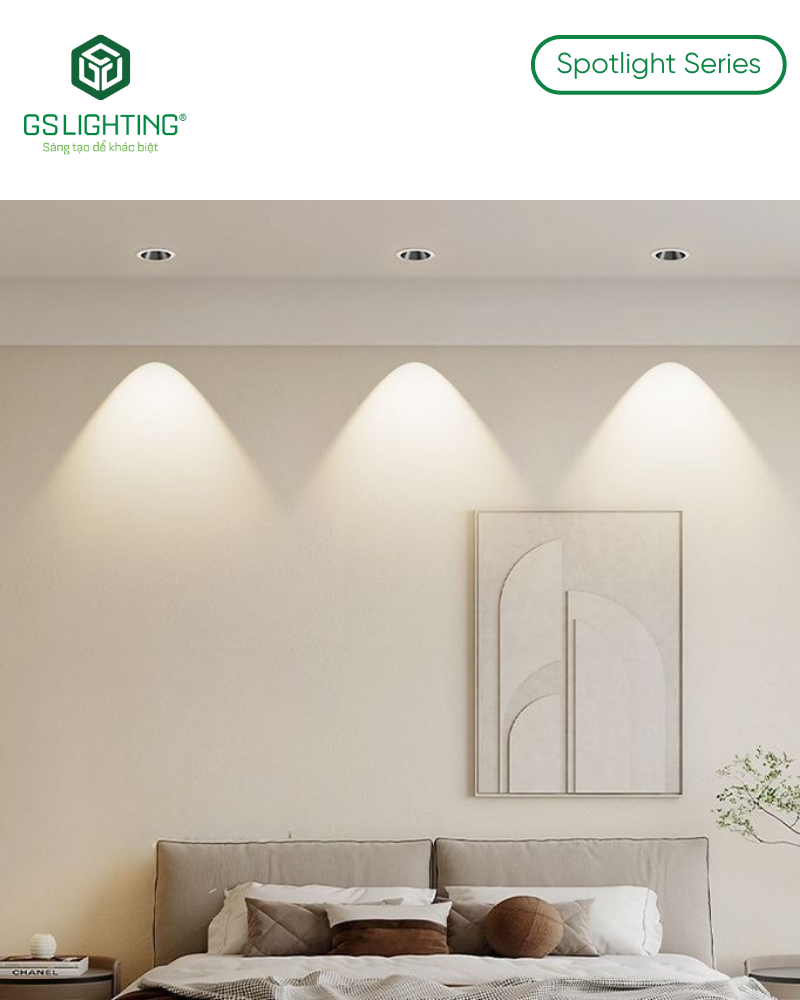 Khác với downlight âm trần chiếu rộng dùng cho chiếu sáng nền, GSATSL12 được thiết kế cho bài toán chiếu nhấn có kiểm soát. Với beam 24°, sản phẩm phù hợp để rọi mảng tường, tranh treo, đầu giường, hốc trang trí, tủ décor, khu lễ tân, vách vật liệu hoặc các điểm cần tạo chiều sâu không gian. Tính năng chỉnh góc là lợi thế rõ rệt khi thi công thực tế, vì giúp đội lắp đặt cân chỉnh lại điểm rọi ngay tại công trình mà không phải thay đổi vị trí khoét trần.