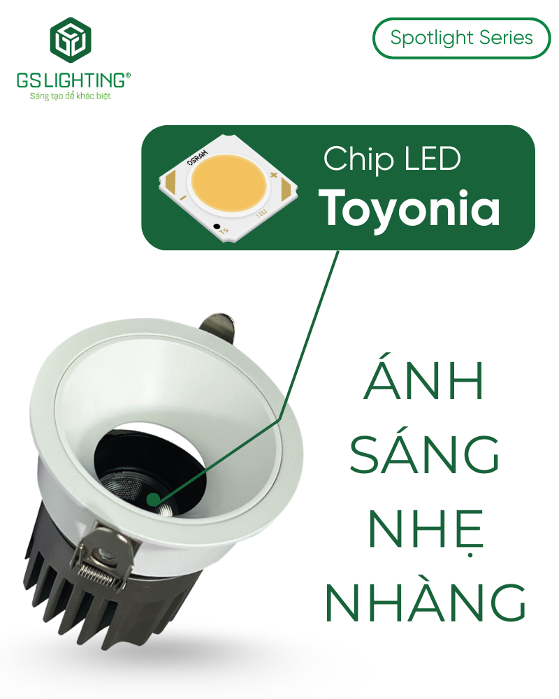 Sản phẩm dùng chip LED Toyonia. Trong nhóm đèn âm trần spotlight, việc công bố rõ chip LED là điểm cộng vì giúp khách hàng kỹ thuật đánh giá được mức độ minh bạch của nhà cung cấp. Giá trị của chip không chỉ nằm ở độ sáng mà còn ở sự phối hợp với quang học để tạo chùm sáng đều, gọn và ổn định màu.