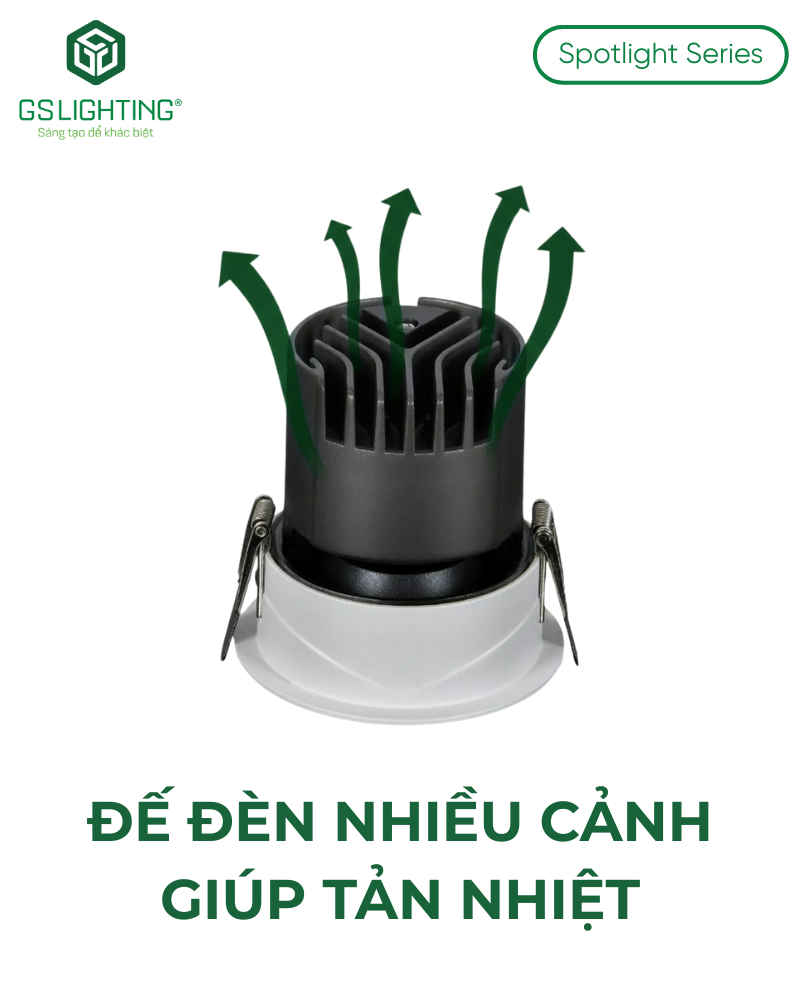 Sản phẩm dùng nhôm mát và có phần đế đèn nhiều cánh tản nhiệt. Đây là chi tiết kỹ thuật có giá trị thực tế, nhất là với spotlight âm trần, vì nhiệt độ vận hành ảnh hưởng trực tiếp đến tuổi thọ chip LED và driver. So với kiểu mô tả “độ bền cao” chung chung, thông tin về cấu trúc tản nhiệt giúp tăng độ tin cậy hơn.