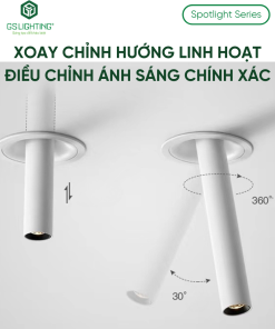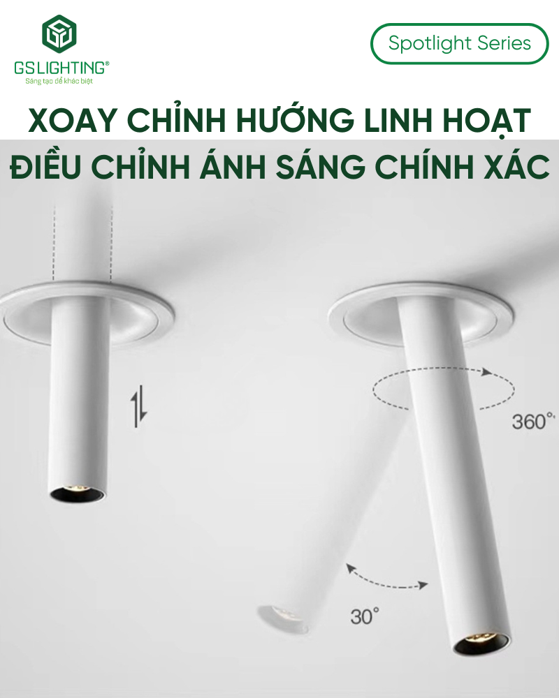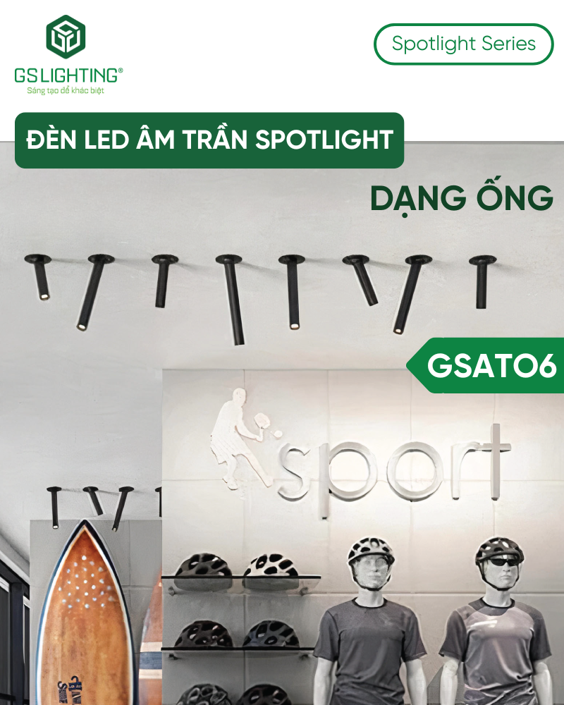 GSATO6 là kiểu spotlight âm trần dạng ống, nổi bật ở phần thân kéo dài xuống khỏi mặt trần. Đây là lựa chọn phù hợp cho công trình muốn tránh cảm giác “đèn chìm hoàn toàn” như downlight âm trần phổ thông.
