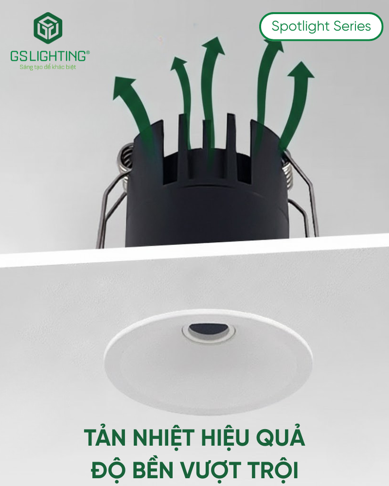 GSDSL-H sử dụng nhôm tản nhiệt, phần thân sau có cánh tản nhiệt để hỗ trợ thoát nhiệt tốt hơn. Với đèn led âm trần công suất nhỏ đến trung bình, đây là yếu tố rất đáng quan tâm vì nhiệt độ vận hành ảnh hưởng trực tiếp đến độ ổn định quang thông và tuổi thọ chip LED.