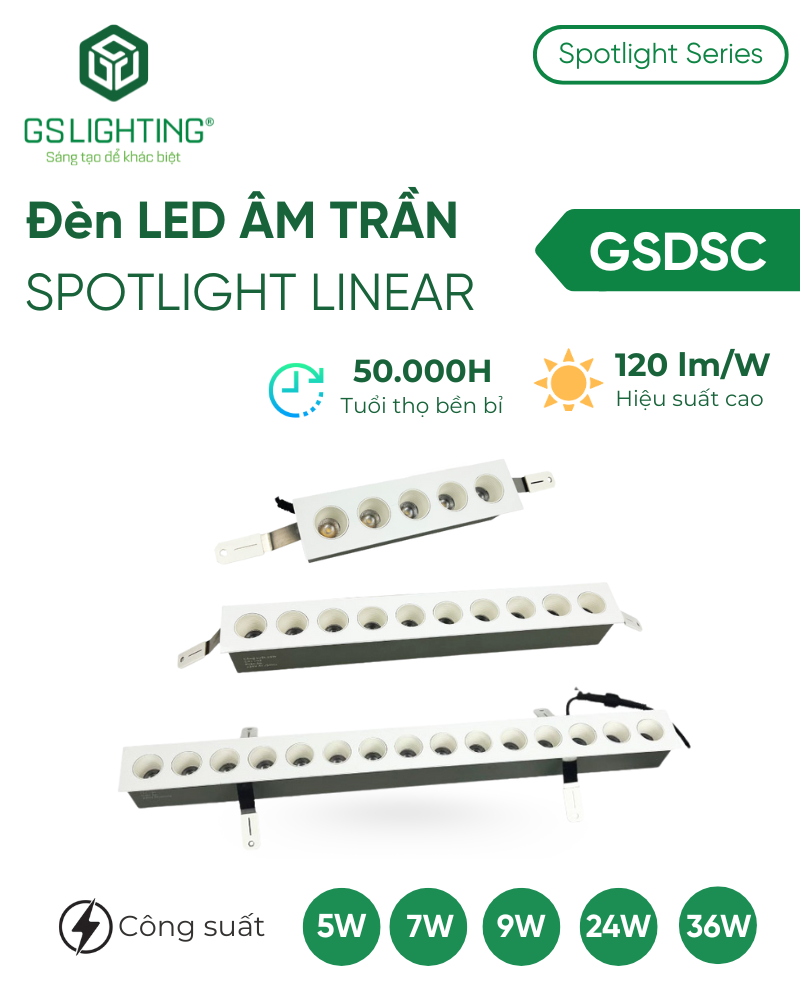 Đèn LED Âm Trần Spotlight Linear 5W 7W 9W 24W 36W GSDSC là giải pháp phù hợp cho các công trình cần đèn led âm trần chiếu điểm dạng thanh, ánh sáng tập trung, chỉ số màu cao và hình thức trần gọn. Đây là dòng sản phẩm đáng cân nhắc cho showroom, retail, hành lang, quầy kệ và các không gian cần ánh sáng nhấn có tính kiến trúc rõ ràng.