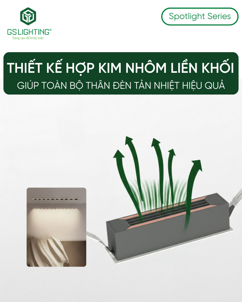Thân đèn làm bằng hợp kim nhôm. Với dòng spotlight linear âm trần, đây là lựa chọn phù hợp vì vừa đảm bảo kết cấu, vừa hỗ trợ tản nhiệt thụ động. Thiết kế linear cũng giúp phân bổ nhiệt dọc thân đèn tốt hơn so với các cụm đèn nhỏ gọn tập trung.