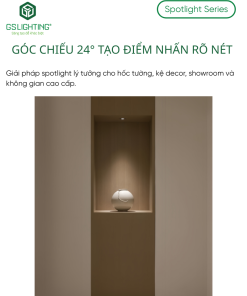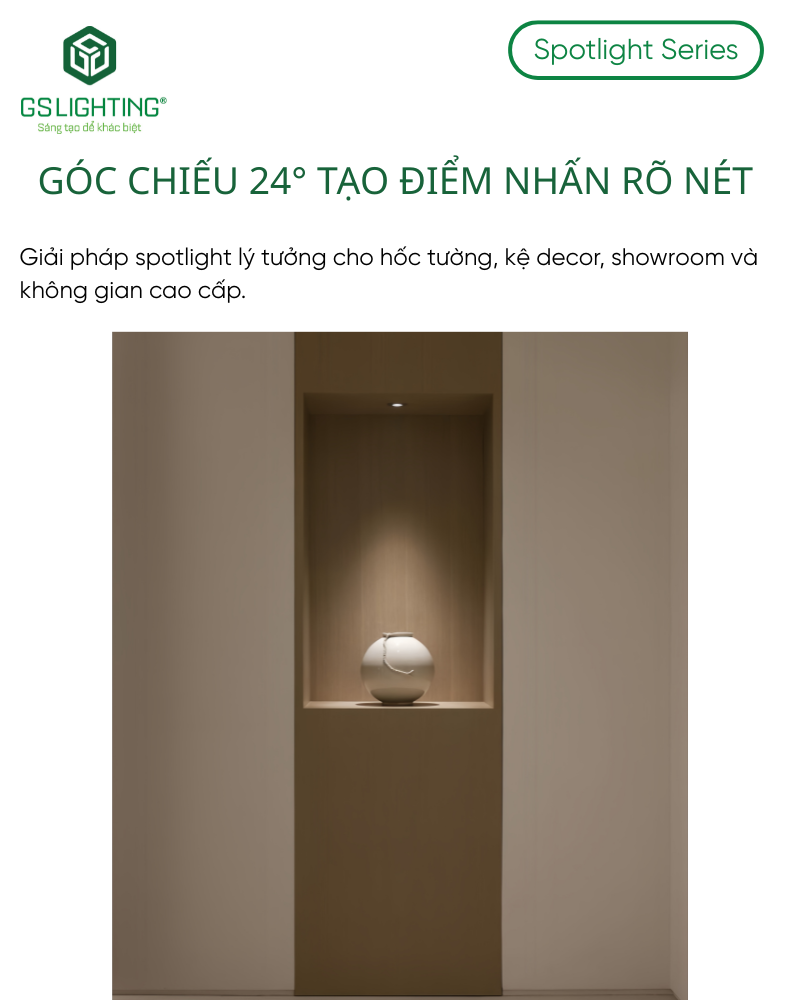 Điểm nổi bật nhất của GSDSM là thiết kế mini nhưng thiên về chiếu điểm chuyên dụng, phù hợp với ngôn ngữ thiết kế hiện đại, nơi trần cần gọn và nguồn sáng không được quá lộ. Beam 24° cho vùng sáng rõ, gom điểm tốt hơn loại downlight phổ thông.