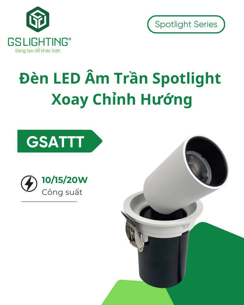 Đèn LED Âm Trần Spotlight Xoay Chỉnh Hướng 10W 15W 20W GSATTT là dòng đèn led âm trần spotlight chuyên dùng cho chiếu nhấn và chiếu định hướng. Khác với downlight âm trần chiếu tỏa rộng, model này có khả năng xoay 360° và chỉnh góc 90°, cho phép người thiết kế và đơn vị thi công chủ động điều chỉnh chùm sáng vào đúng vật thể hoặc đúng mảng tường cần làm nổi bật.