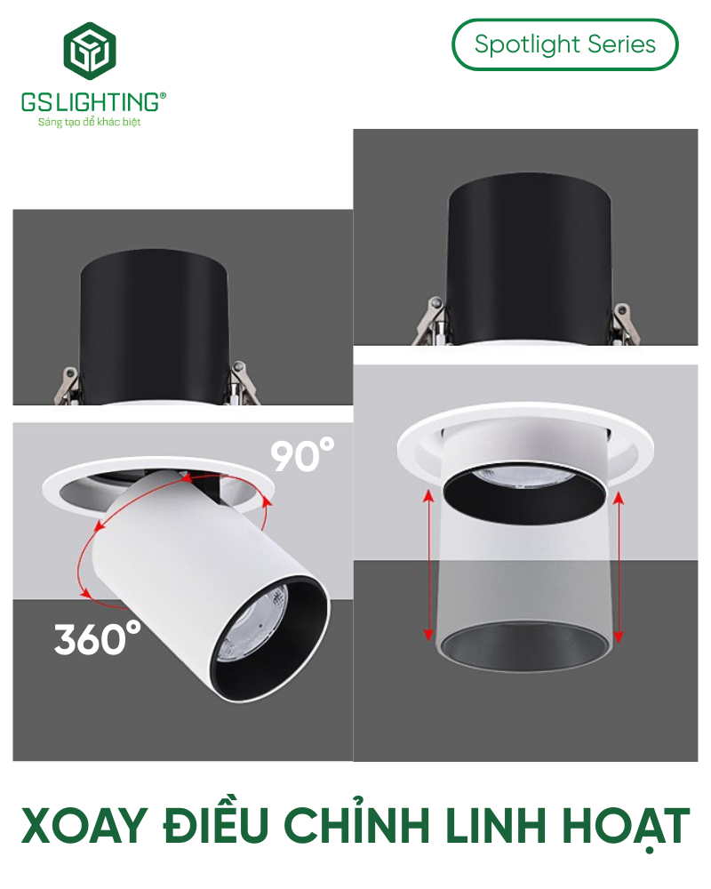 Điểm mạnh lớn nhất của GSATTT là khả năng điều hướng ánh sáng sau khi lắp. Đây là lợi thế rất thực tế trong công trình, vì nhiều trường hợp mặt bằng thay đổi décor, thay đổi vị trí sản phẩm trưng bày hoặc cần chỉnh lại điểm nhấn mà không muốn khoét lại trần. Khả năng xoay 360° và chỉnh 90° giúp đội thi công xử lý linh hoạt hơn nhiều so với đèn spotlight cố định.