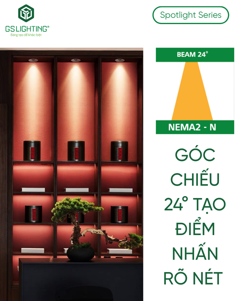 Với hiệu suất 120 lm/W và góc chiếu 24°, GSATTT không chạy theo kiểu sáng tràn mà tập trung đưa ánh sáng vào đúng vùng cần nhấn. Đây là cách dùng sáng hiệu quả hơn cho quầy trưng bày, tranh, hốc trang trí, quầy lễ tân, tủ rượu hoặc mảng tường vật liệu. Các mức màu 3000K, 4000K, 5000K cho phép chọn theo phong cách công trình. 3000K hợp hospitality và residential cao cấp; 4000K hợp showroom, retail, văn phòng; 5000K phù hợp các khu cần cảm giác sáng rõ hơn. CRI Ra90+ đủ tốt cho các bề mặt gỗ, sơn, đá, vải và sản phẩm trưng bày.