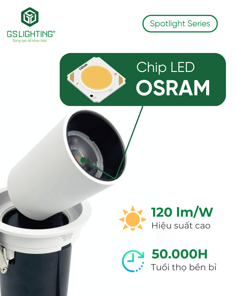 Dữ liệu hiện có cho thấy sản phẩm sử dụng chip LED Osram. Với nhóm spotlight âm trần, chip LED là yếu tố ảnh hưởng trực tiếp đến độ ổn định màu, chất lượng chùm sáng và độ tin cậy khi vận hành liên tục. Đây là điểm có giá trị với khách hàng dự án, vì cùng một thiết kế đẹp nhưng nếu chip không ổn định thì sau một thời gian sẽ lộ lệch màu, suy sáng hoặc ánh sáng không đều.