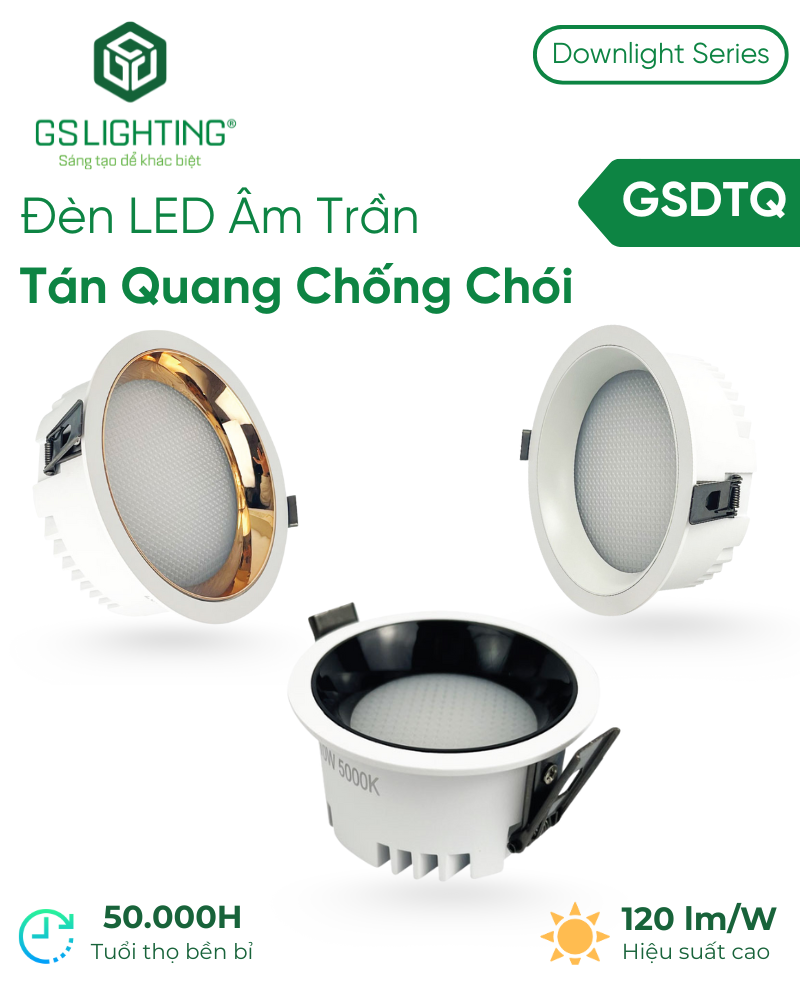 So với đèn downlight âm trần phổ thông, GSDTQ có lợi thế ở Ra90+, SDCM <3 và định hướng chống chói, phù hợp công trình chất lượng cao hơn.