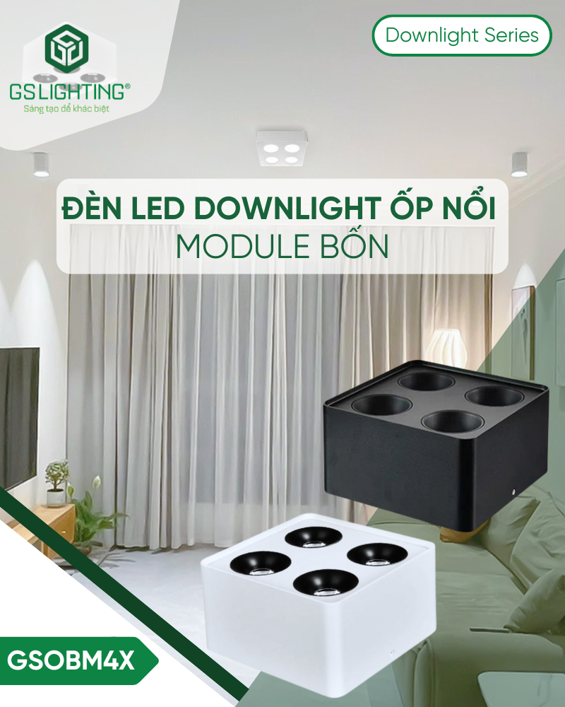 Điểm nổi bật nhất của GSOBM4X là khả năng tạo ra một cụm sáng mạnh và có tính tổ chức cao chỉ bằng một điểm lắp đặt. Thay vì dùng nhiều đèn đơn lẻ, công trình có thể sử dụng một bộ đèn downlight ốp nổi module bốn để tạo hiệu ứng chiếu sáng gọn, mạnh và có nhịp điệu rõ trên trần.
