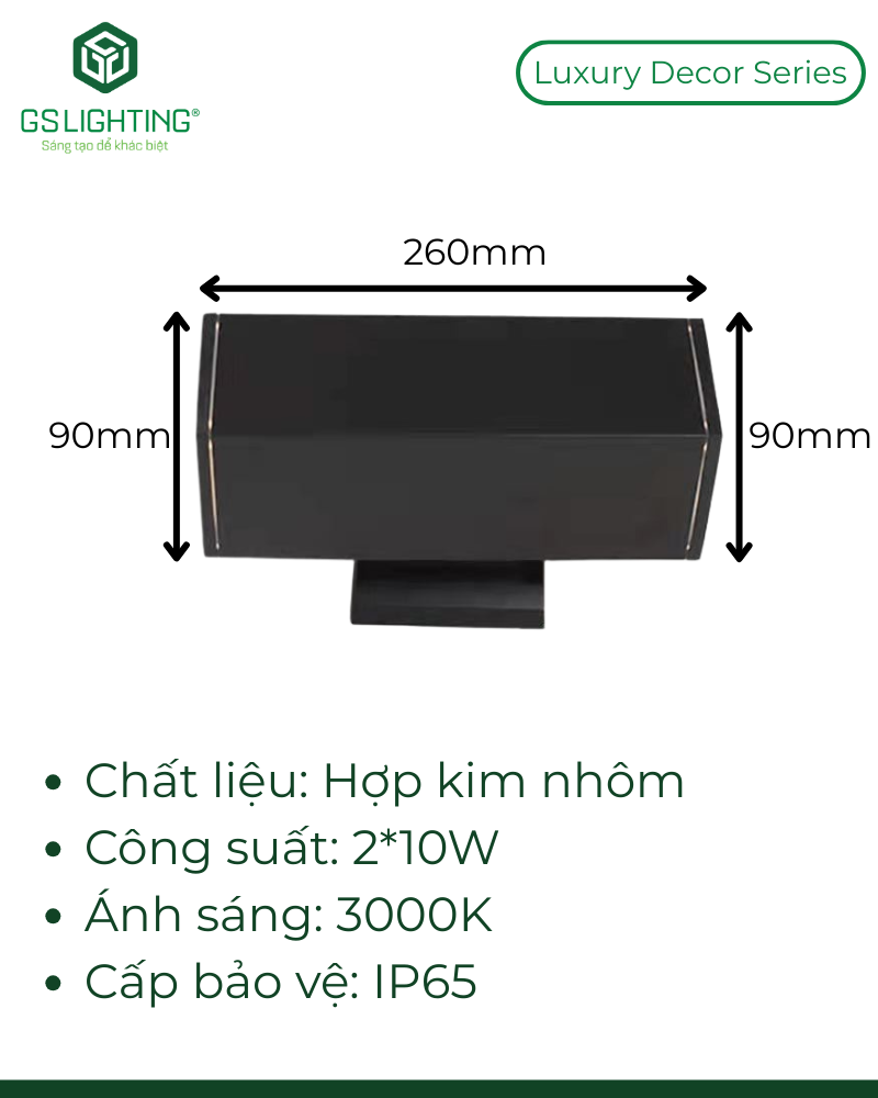 GS-HT2H có thiết kế hình khối vuông vức, gọn nhưng vẫn đủ tỷ lệ để xuất hiện rõ trên mặt đứng công trình. Kích thước W90 x H260 mm phù hợp với các bề mặt tường có chiều cao vừa và lớn, giúp đèn nhìn cân đối hơn so với các mẫu quá nhỏ khi lắp ở mặt tiền nhà phố, villa hoặc sảnh ngoài trời.